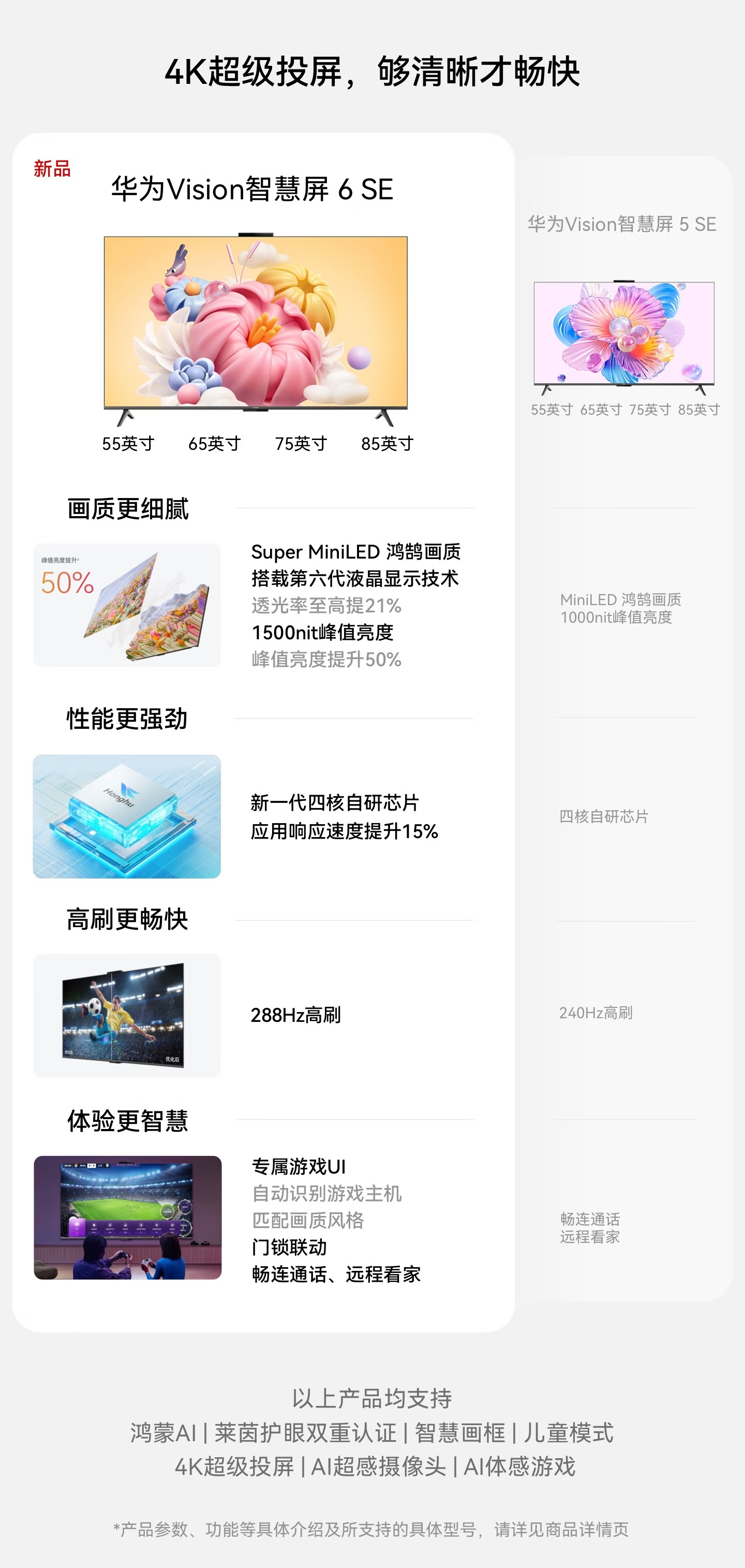华为 Vision 智慧屏 6 SE 搭载 Super Mini LED 第六代液晶屏,支持 178° 视角,以及 4K 288Hz 倍频高刷,还有新一代双核 A53+ 双核 A73 鸿鹄自研芯片。